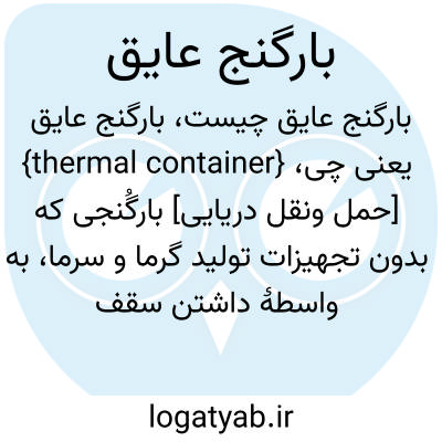 {thermal container} [حمل ونقل دریایی] بارگُنجی که بدون تجهیزات تولید گرما و سرما، به واسطۀ داشتن سقف و کف و در و دیواره های عایق، دمای مطلوب را حفظ می کند