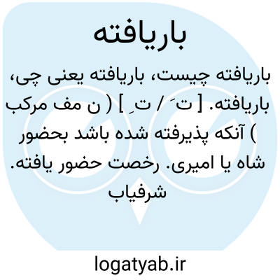 باریافته. [ ت َ / ت ِ ] ( ن مف مرکب ) آنکه پذیرفته شده باشد بحضور شاه یا امیری. رخصت حضور یافته. شرفیاب شده. قبول شده و اذن داده شده. ( ناظم الاطباء ). پذیرفته شده حضور شاه. ( دِمزن ): از خواص باریافتگان صحبت شریف حضرت خواجه ما قدس اﷲ روحه بودند. ( انیس الطالبین نسخه خطی کتابخانه مؤلف )... و از جمله مقربان دربار گیتی مدار و باریافتگان مجالس خاص و عام... ( تذکرةالملوک چ 2 ص 25 ). || نوکر و محافظ حرمخانه. ( ناظم الاطباء ) ( دِمزن ).