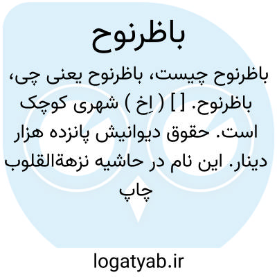 باظرنوح. [ ] ( اِخ ) شهری کوچک است. حقوق دیوانیش پانزده هزار دینار. این نام در حاشیه نزهةالقلوب چاپ لیدن بصورت «ناظربوح » نیزآمده ولی صحیح ضبط فوقست در نسخه خطی قدیم ضبط باطونوح نیز دیده شد. ( نزهةالقلوب چ دبیرسیاقی ص 121 ).