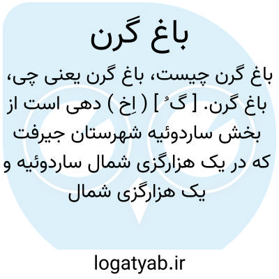 باغ گرن. [ گ ُ ] ( اِخ ) دهی است از بخش ساردوئیه شهرستان جیرفت که در یک هزارگزی شمال ساردوئیه و یک هزارگزی شمال راه فرعی ساردوئیه به راین واقع است و 10 تن سکنه دارد. ( از فرهنگ جغرافیایی ایران ج 8 ).