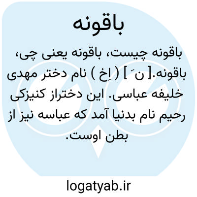 باقونه.[ ن َ ] ( اِخ ) نام دختر مهدی خلیفه عباسی. این دختراز کنیزکی رحیم نام بدنیا آمد که عباسه نیز از بطن اوست. رجوع به عقدالفرید ج 5 ص 342 و 343 و 394 شود.