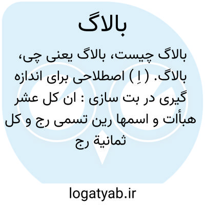 بالاگ. ( اِ ) اصطلاحی برای اندازه گیری در بت سازی: ان کل عشر هبأات و اسمها رین تسمی رج و کل ثمانیة رج تکون بالاگ و هو رأس الشعرة و ثمانیة منه لیک و هو الصوابة فی الشعر... ( ماللهند بیرونی ص 77 ).