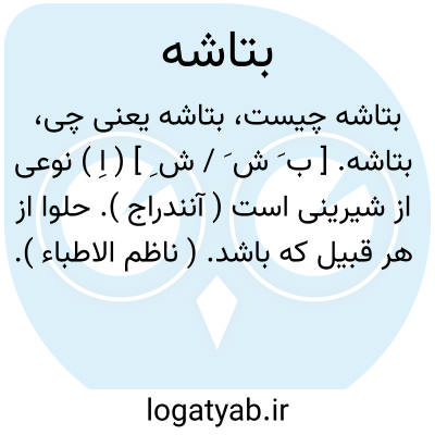 بتاشه. [ ب َ ش َ / ش ِ ] ( اِ ) نوعی از شیرینی است ( آنندراج ). حلوا از هر قبیل که باشد. ( ناظم الاطباء ).