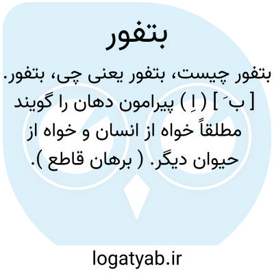 بتفور. [ ب َ ] ( اِ ) پیرامون دهان را گویند مطلقاً خواه از انسان و خواه از حیوان دیگر. ( برهان قاطع ). پیرامون دهن. پوز. برپوز. برپوس. ( فرهنگ جهانگیری ). اطراف دهن. گرداگرد دهان. بتپوز. بدفوز. ( فرهنگ ضیاء ). گرداگرد دهان حیوانات و انسان. ( ناظم الاطباء ):