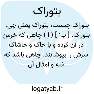 بتوراک. [ ب َ ] ( اِ ) چاهی که خرمن در آن کرده و با خاک و خاشاک سرش را بپوشانند. چاهی باشد که غله و امثال آن در آن کنند و خاک بر بالای آن ریزند. ( برهان قاطع ). و آن را به فارسی گوری نیز گویند زیراکه به گور ماند که قبر باشد. ( انجمن آرای ناصری ) ( آنندراج ). محلی که غله نگاه میدارند. ( از فرهنگ شعوری ). چاهی که غله در آن مدفون کنند. ( فرهنگ رشیدی ). || دف. دایره. ( برهان قاطع ) ( انجمن آرا ) ( آنندراج ). و به این معنی به صورت تبوراک هم آمده است. ( برهان قاطع ). تصحیف تبوراک است و تبیره و تبیر و طنبور از همین ریشه است. ( یادداشت مؤلف ):