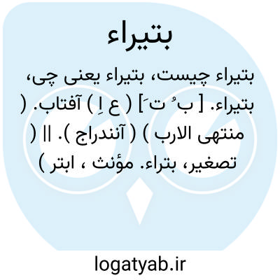 بتیراء. [ ب ُ ت َ] ( ع اِ ) آفتاب. ( منتهی الارب ) ( آنندراج ). || ( تصغیر، بتراء. مؤنث، ابتر ) ناتمام. ( آنندراج ).در حدیث نهی عن البتیرا، آن است که به یک رکعت وتر بخواند و گویند آن است که شروع کند در دو رکعت اولی را تمام و دومی را قطع کند. ( منتهی الارب ). و فی الحدیث: انه نهی عن البتیراء و هو ان یوتر برکعة واحدة، وقیل ان یشرع فی رکعتین فاتم الاولی و قطع الثانیة.