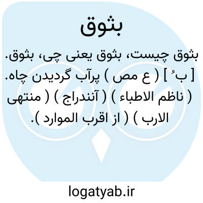 لغت نامه دهخدا بثوق. [ ب ُ ] ( ع مص ) پرآب گردیدن چاه. ( ناظم الاطباء ) ( آنندراج ) ( منتهی الارب ) ( از اقرب الموارد ).