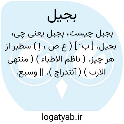 لغت نامه دهخدا بجیل. [ ب َ ] ( ع ص، اِ ) سطبر از هر چیز. ( ناظم الاطباء ) ( منتهی الارب ) ( آنندراج ). || وسیع. فراخ. || آنکه او را تعظیم کنند. مهتر بزرگ با عظمت و جمال. ( ناظم الاطباء ) ( آنندراج ) ( منتهی الارب ).