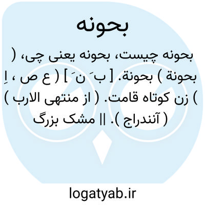 ( بحونة ) بحونة. [ ب َ ن َ ] ( ع ص، اِ ) زن کوتاه قامت. ( از منتهی الارب ) ( آنندراج ). || مشک بزرگ شکم. ( آنندراج ). مشک فراخ شکم. ( منتهی الارب ) ( اقرب الموارد ). || ( اِخ ) نام شخصی. ( آنندراج ) ( منتهی الارب ).