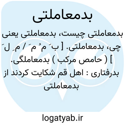 بدمعاملتی. [ ب َ م ُ م َ / م ِ ل َ ] ( حامص مرکب ) بدمعاملگی. بدرفتاری: اهل قم شکایت کردند از بدمعاملتی عمال که در اندک مدتی پیاپی به قم آمدند و هر کس که می آمد مال آن زیاده می کردند. ( تاریخ قم ص 104 ). دیگرباره دهاقین از احوص و بدمعاملتی او با ایشان شکایت کرد. ( تاریخ قم ص 245 ).