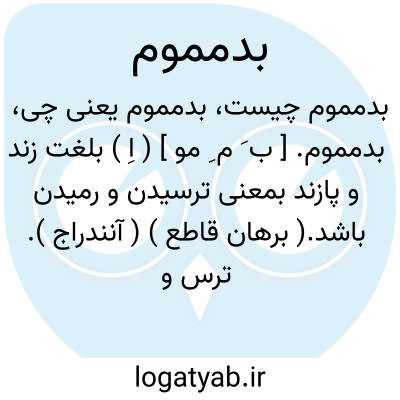 لغت نامه دهخدا بدمموم. [ ب َ م ِ مو ] ( اِ ) بلغت زند و پازند بمعنی ترسیدن و رمیدن باشد.( برهان قاطع ) ( آنندراج ). ترس و رمیدن باشد. ( برهان قاطع ) ( آنندراج ). ترس و رم و فرار. ( ناظم الاطباء ).