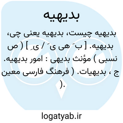 بدیهیه. [ ب َ هی ی َ / ی ِ ] ( ص نسبی ) مؤنث بدیهی: امور بدیهیه. ج، بدیهیات. ( فرهنگ فارسی معین ).