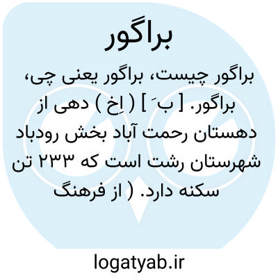 براگور. [ ب َ ] ( اِخ ) دهی از دهستان رحمت آباد بخش رودباد شهرستان رشت است که 233 تن سکنه دارد. ( از فرهنگ جغرافیایی ایران ج 2 ).