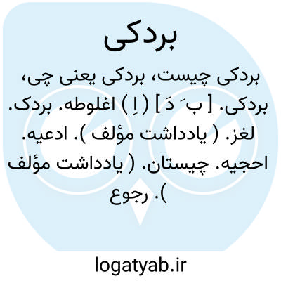 بردکی. [ ب َ دَ ] ( اِ ) اغلوطه. بردک. لغز. ( یادداشت مؤلف ). ادعیه. احجیه. چیستان. ( یادداشت مؤلف ). رجوع به برد و بردک شود.