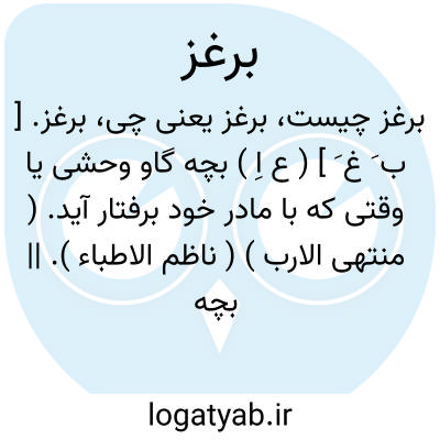 برغز. [ ب َ غ َ ] ( ع اِ ) بچه گاو وحشی یا وقتی که با مادر خود برفتار آید. ( منتهی الارب ) ( ناظم الاطباء ). || بچه گاو دشتی. ( مهذب الاسماء ). بُرغز. برغوز. برغاز. ( منتهی الارب ).