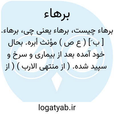 لغت نامه دهخدا برهاء. [ ب َ] ( ع ص ) مؤنث أبره. بحال خود آمده بعد از بیماری و سرخ و سپید شده. ( از منتهی الارب ) ( از اقرب الموارد ). ج، بُرْه. ( اقرب الموارد ). و رجوع به بَره شود.