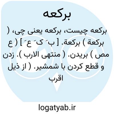 ( برکعة ) برکعة. [ ب َ ک َ ع َ ] ( ع مص ) بریدن. ( منتهی الارب ). زدن و قطع کردن با شمشیر. ( از ذیل اقرب الموارد ). || بر زمین زدن. ( منتهی الارب ) ( از اقرب الموارد ) ( ناظم الاطباء ). || بر چهار دست و پا ایستادن. ( ازاقرب الموارد ) ( ناظم الاطباء ). || بر دو زانو افتادن. ( از ذیل اقرب الموارد ) ( ناظم الاطباء ).