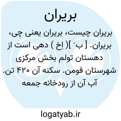 بریران. [ ب َ ]( اِخ ) دهی است از دهستان تولم بخش مرکزی شهرستان فومن. سکنه آن 420 تن. آب آن از رودخانه جمعه بازار معروف به قلعه رودخان و محصول آن برنج، توتون سیگاری،کنف و ابریشم است. ( از فرهنگجغرافیایی ایران ج 2 ).