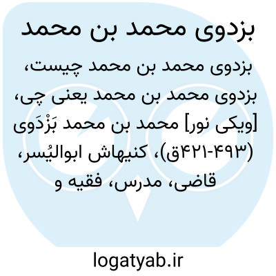 [ویکی نور] محمد بن محمد بَزْدَوی (421-493ق)، کنیهاش ابوالیُسر، قاضی، مدرس، فقیه و محدث حنفی بوده است. ابویعقوب یوسف بن منصور سیاری، از جمله مشایخ وی، نجمالدین نسفی، از جمله شاگردان او و المبسوط، در فروع فقه حنفی، از جمله آثار ایشان است.