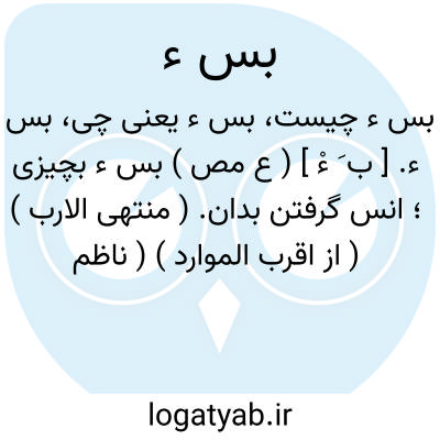 لغت نامه دهخدا بس ء. [ ب َ ءْ ] ( ع مص ) بس ء بچیزی؛ انس گرفتن بدان. ( منتهی الارب ) ( از اقرب الموارد ) ( ناظم الاطباء ). خوگر شدن. ( ناظم الاطباء ). بسوء. ( اقرب الموارد ) ( ناظم الاطباء ). انس گرفتن و آرام گرفتن. ( ناظم الاطباء ) ( منتهی الارب ). || تمرین کردن هر چیزی. ( از اقرب الموارد ). || بس ء بچیزی؛ سهل انگاری کردن بدان. تهاون. ( از اقرب الموارد ). تهاون نمودن. ( ناظم الاطباء ) ( منتهی الارب ). بسوء. ( اقرب الموارد ).