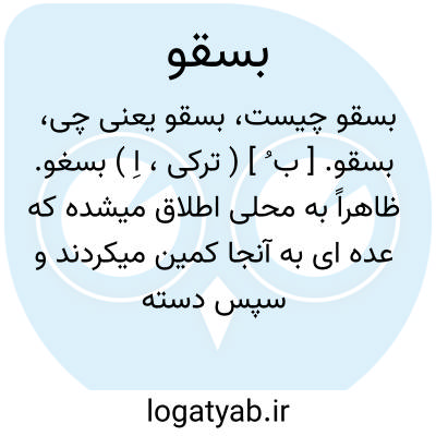 بسقو. [ ب ُ ] ( ترکی، اِ ) بسغو. ظاهراً به محلی اطلاق میشده که عده ای به آنجا کمین میکردند و سپس دسته ای از آنها جدا میشدند و بجنگ خصم میرفتند و با خصم جنگ و گریز می کردند و در حال فریب دشمن دمادم خویش تا بسقو می کشیدند. خصم بی خبر، ناگاه به افراد مقیم در بسقو برمی خورد و دست و پای خود را گم کرده یا مغلوب میشد یا فرار میکرد. ( عالم آرای نادری چ عکسی روسیه ص 145 و147، نقل از تعلیقات جهانگشای نادری چ انوار ص 533 چ طهران انجمن آثار ملی 1341 هَ. ش. ): آن حضرت بقصد اینکه ایشان را بکمین گاه دلیران کشاند و آن صید خون گرفته را بسر تیر رساند جنگی بگریز آغاز نموده کمیت برق تک را بسمت بسقو گرم عنان و یکران گران رکاب را تا ظاهر قلعه قازما سبک جولان ساختند. ( جهانگشای نادری چ انوار چ طهران 1341 هَ. ش. ص 48 ). سیصد سوار را در نزدیکی خندق در بسقو گذاشت. ( مجمل التواریخ گلستانه ). به طرف کوهی که سمت دست راست پادشاه بود بسقو انداخت... علیمردان خان با سواران غافل از بسقوی کوه برآمده از عقب تاخت. ( مجمل التواریخ گلستانه ).