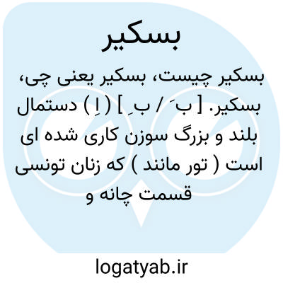 بسکیر. [ ب َ / ب ِ ] ( اِ ) دستمال بلند و بزرگ سوزن کاری شده ای است ( تور مانند ) که زنان تونسی قسمت چانه و پایین صورت خود را در آن پیچند و دو سر آن را به پشت سر گره زنند و تا سر زانو آویخته باشد، و گاهی تا زیر چشمان را نیز پوشد. ( از دزی ج 1 ص 87 ).