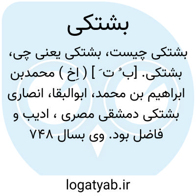 بشتکی. [ب ُ ت َ ] ( اِخ ) محمدبن ابراهیم بن محمد، ابوالبقا، انصاری بشتکی دمشقی مصری، ادیب و فاضل بود. وی بسال 748 هَ. ق. متولد شد و بسال 830 هَ. ق. در قاهره درگذشت. او راست: طبقات الشعراء و مرکزالاحاطه و دیوان شعر. ( از حسن المحاضرة ص 362 ) ( اعلام زرکلی ج 3 ص 842 ).