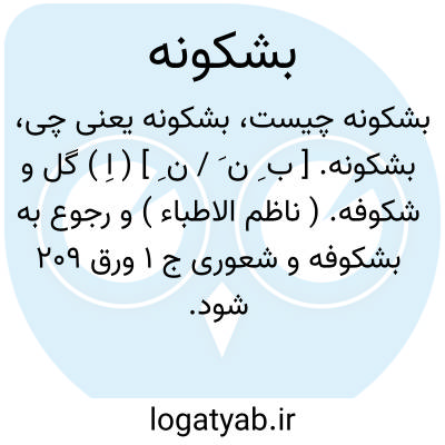 لغت نامه دهخدا بشکونه. [ ب ِ ن َ / ن ِ ] ( اِ ) گل و شکوفه. ( ناظم الاطباء ) و رجوع به بشکوفه و شعوری ج 1 ورق 209 شود. || استفراغ و قی بسیار و مکرر. ( ناظم الاطباء ). و رجوع به بشکوفه و اشکوفه شود.