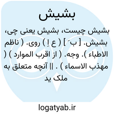 بشیش. [ ب َ ] ( ع اِ ) روی. ( ناظم الاطباء ). وجه. ( از اقرب الموارد ) ( مهذب الاسماء ). || آنچه متعلق به ملک ید باشد. ( ناظم الاطباء ). ملک ید. ( از اقرب الموارد ). || بشاش.