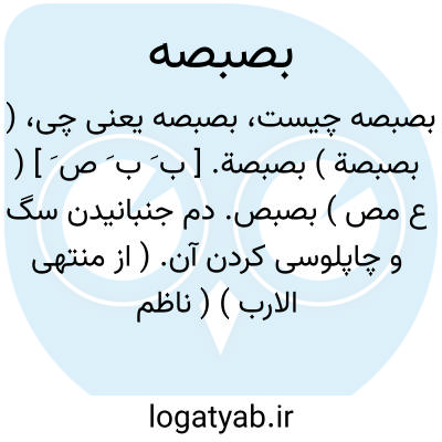 ( بصبصة ) بصبصة. [ ب َ ب َ ص َ ] ( ع مص ) بصبص. دم جنبانیدن سگ و چاپلوسی کردن آن. ( از منتهی الارب ) ( ناظم الاطباء ) ( آنندراج ). دم جنبانیدن سگ و آهو و شتر. ( از اقرب الموارد ). دنبال جنبانیدن. ( تاج المصادر بیهقی ). دم جنبانیدن سگ. ( دزی ج 1 ص 91 ). || تملق. تبصبص. || چشم باز کردن سگ بچه نوزاد. ( منتهی الارب ) ( از آنندراج ) ( ناظم الاطباء ) ( از اقرب الموارد ). || بگوشه چشم نگریستن. زیر چشمی نگاه کردن. ( دزی ج 1 ص 91 ). || چشمک زدن به کسی. به او اشاره کردن. علامت دادن. ( دزی ج 1 ص 91 ). || شتافتن شتران. ( منتهی الارب ) ( ناظم الاطباء ). || برآوردن زمین آنچه را که اول برمی آورد. ( منتهی الارب ) ( ناظم الاطباء ) ( آنندراج ) ( از اقرب الموارد ).
