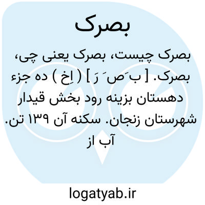 بصرک. [ ب َص َ رَ ] ( اِخ ) ده جزء دهستان بزینه رود بخش قیدار شهرستان زنجان. سکنه آن 139 تن. آب از چشمه سار. محصول آنجا غلات. شغل اهالی آن زراعت. صنایع دستی آن قالیچه و گلیم بافی است. ( از فرهنگ جغرافیایی ایران ج 2 ).