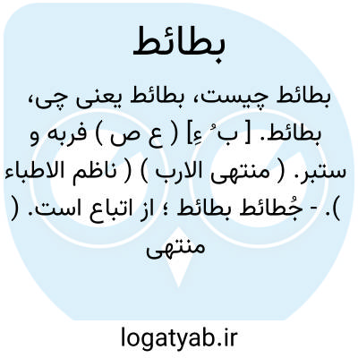 لغت نامه دهخدا بطائط. [ ب ُ ءِ] ( ع ص ) فربه و ستبر. ( منتهی الارب ) ( ناظم الاطباء ).- جُطائط بطائط؛ از اتباع است. ( منتهی الارب ) ( ناظم الاطباء ).بطائط. [ ب ِ ءِ ] ( ع ص ) فرج ستبر و گنده: حر بطائط. ( ناظم الاطباء ).