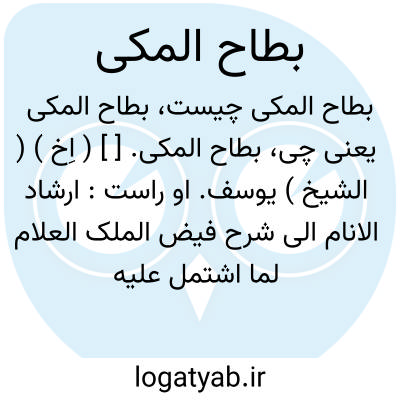 لغت نامه دهخدا بطاح المکی. [ ] ( اِخ ) ( الشیخ ) یوسف. او راست: ارشاد الانام الی شرح فیض الملک العلام لما اشتمل علیه النسک من الاحکام که بسال 1244 هَ. ق. در مکه از تألیف آن فراغت یافته. چ مصر 1299 هَ. ق. ( معجم المطبوعات ستون 568 ).