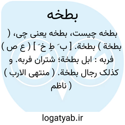 ( بطخة ) بطخة. [ ب َ طِ خ َ ] ( ع ص ) فربه: ابل بطخة؛ شتران فربه. و کذلک رجال بطخة. ( منتهی الارب ) ( ناظم الاطباء ).
