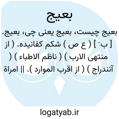 بعیج. [ ب َ ] ( ع ص ) شکم کفانیده. ( از منتهی الارب ) ( ناظم الاطباء ) ( آنندراج ) ( از اقرب الموارد ). || امراة بعیج؛ زنی که در خیرخواهی شوی بسیار مبالغه نماید و بر وی نثار کند. ( منتهی الارب ) ( از ناظم الاطباء ) ( آنندراج ).