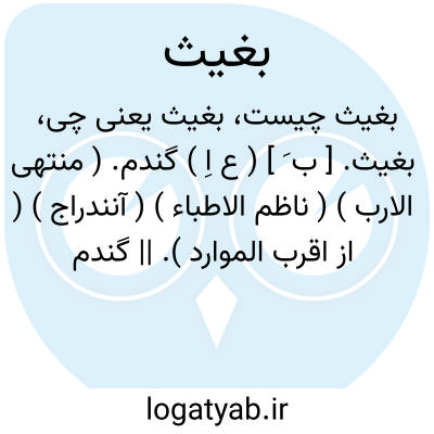 بغیث. [ ب َ ] ( ع اِ ) گندم. ( منتهی الارب ) ( ناظم الاطباء ) ( آنندراج ) ( از اقرب الموارد ). || گندم مخلوط به جو. ( منتهی الارب ) ( ناظم الاطباء ) ( آنندراج ). || طعام مخلوط به جو. ( از اقرب الموارد ).
