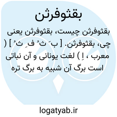 بقثوفرثن. [ ب َ ث ُ ف ِ ث ُ ] ( معرب، اِ ) لغت یونانی و آن نباتی است برگ آن شبیه به برگ تره تیزک و از آن ضخیم تر و تیزطعم و ساق آن مربع و گل آن شبیه بگل بادروج و تخم آن مانند تخم گندنا و بیخ آن سیاه مدور مایل به زردی و کوچکتر از سیب و بوی آن شبیه به بوی شراب و منبت آن سنگلاخهاست. ( مخزن الادویه ).