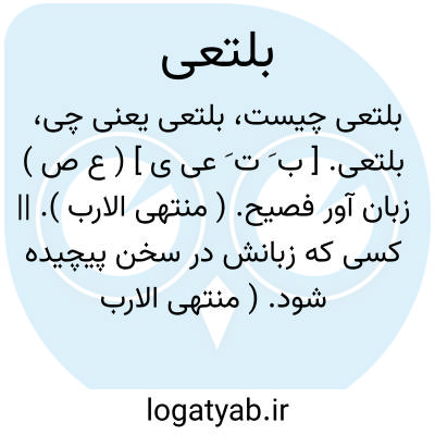 بلتعی. [ ب َ ت َ عی ی ] ( ع ص ) زبان آور فصیح. ( منتهی الارب ). || کسی که زبانش در سخن پیچیده شود. ( منتهی الارب ).