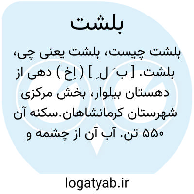 بلشت. [ ب َ ل ِ ] ( اِخ ) دهی از دهستان بیلوار، بخش مرکزی شهرستان کرمانشاهان.سکنه آن 550 تن. آب آن از چشمه و رودخانه سرتخت ومحصول آن غلات، حبوب، توتون، لبنیات، انگور، گردو و سایر میوه ها است. ( از فرهنگ جغرافیایی ایران ج 5 ).