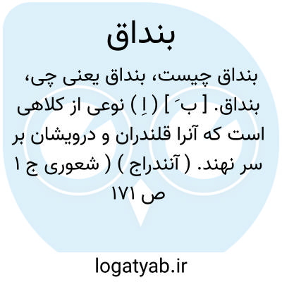 بنداق. [ ب َ ] ( اِ ) نوعی از کلاهی است که آنرا قلندران و درویشان بر سر نهند. ( آنندراج ) ( شعوری ج 1 ص 171 ). یک قسم کلاهی دراز و شبیه بتاج که درویشان و قلندران می پوشند. ( ناظم الاطباء ). کلاهی دراز شبیه به تاجی که درویشان و قلنداران بر سر گذارند. ( فرهنگ فارسی معین ).