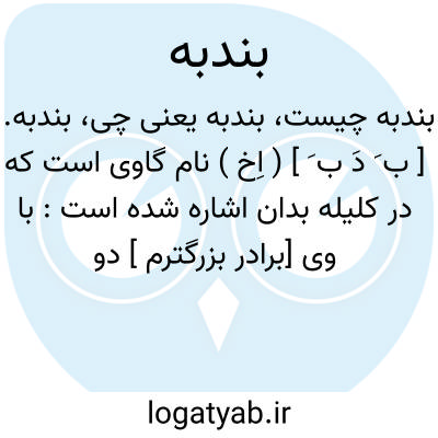 لغت نامه دهخدا بندبه. [ ب َ دَ ب َ ] ( اِخ ) نام گاوی است که در کلیله بدان اشاره شده است: با وی [برادر بزرگترم ] دو گاو بود یکی را شتربه نام و دیگری را بندبه. ( کلیله و دمنه ).