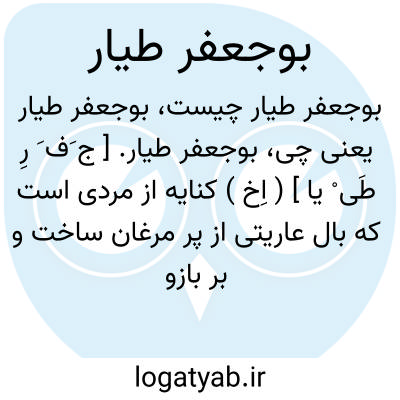 بوجعفر طیار. [ ج َف َ رِ طَی ْ یا ] ( اِخ ) کنایه از مردی است که بال عاریتی از پر مرغان ساخت و بر بازو وصل نمود و بپرید. وقتی از جایی بلند، پریده در نیمه راه خللی در بال او پیدا شد بیفتاد و بمرد. ( انجمن آرا ):
