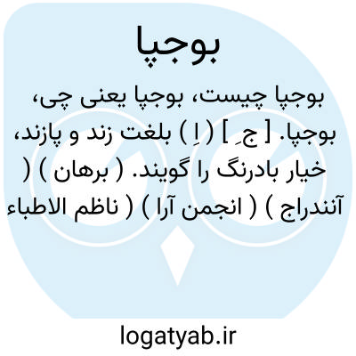 بوجپا. [ ج ِ ] ( اِ ) بلغت زند و پازند، خیار بادرنگ را گویند. ( برهان ) ( آنندراج ) ( انجمن آرا ) ( ناظم الاطباء ). هزوارش «بوچینا»، «بئوجینه »، پهلوی «خیار»... بوچیناک خیار... بنابراین بوجپا، مصحف بوجینا و بوچینا است. ( حاشیه برهان چ معین ).