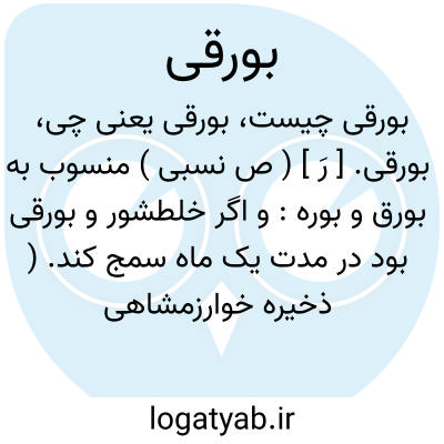 بورقی. [ رَ ] ( ص نسبی ) منسوب به بورق و بوره: و اگر خلطشور و بورقی بود در مدت یک ماه سمج کند. ( ذخیره خوارزمشاهی ). بلغم بورقی، آن است که سخت گرم باشد و طعم او از شوری به تیزی گراید. ( ذخیره خوارزمشاهی ).