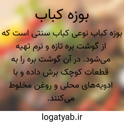 بوزه کباب نوعی کباب سنتی است که از گوشت بره تازه و نرم تهیه می‌شود. در این غذا، معمولاً گوشت بره را به قطعات کوچک برش داده و با ادویه‌های محلی و روغن مخلوط می‌کنند تا طعم و مزه گوشت تقویت شود. بوزه کباب به دلیل استفاده از گوشت بره، نرم و خوش‌طعم است و در بسیاری از مناطق ایران و کشورهای خاورمیانه محبوبیت دارد.