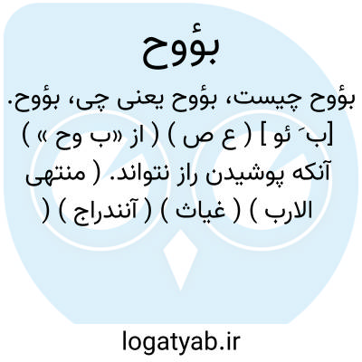 لغت نامه دهخدا بؤوح. [ب َ ئو ] ( ع ص ) ( از «ب وح » ) آنکه پوشیدن راز نتواند. ( منتهی الارب ) ( غیاث ) ( آنندراج ) ( از اقرب الموارد ).