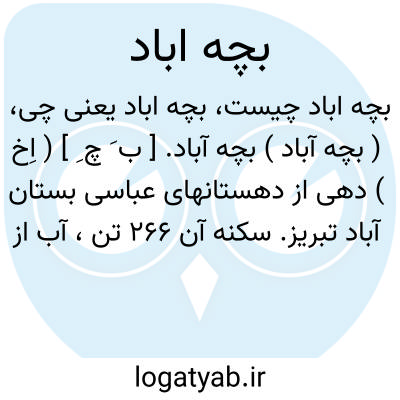 ( بچه آباد ) بچه آباد. [ ب َ چ ِ ] ( اِخ ) دهی از دهستانهای عباسی بستان آباد تبریز. سکنه آن 266 تن، آب از چشمه، محصول آن غلات و یونجه است. احتمال داده شده است که این نام بهجت آباد باشد. ( از فرهنگ جغرافیایی ایران ج 4 ).