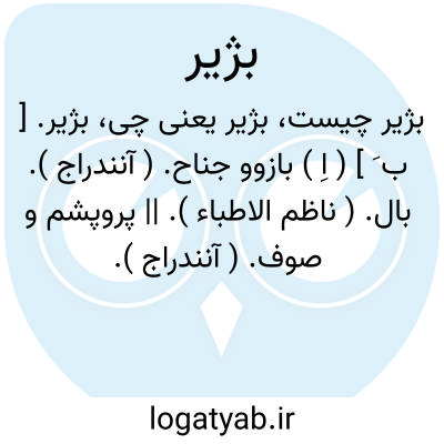 بژیر. [ ب َ ] ( اِ ) بازوو جناح. ( آنندراج ). بال. ( ناظم الاطباء ). || پروپشم و صوف. ( آنندراج ). پروپشم. ( ناظم الاطباء ).