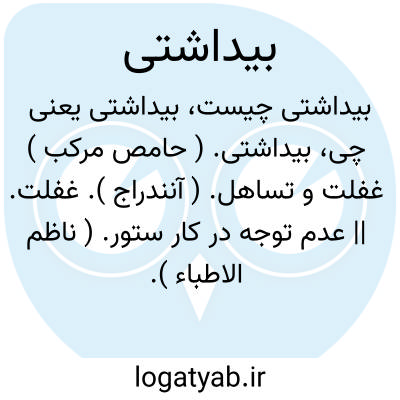 لغت نامه دهخدا بیداشتی. ( حامص مرکب ) غفلت و تساهل. ( آنندراج ). غفلت. || عدم توجه در کار ستور. ( ناظم الاطباء ).