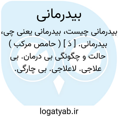 بیدرمانی. [ دَ ] ( حامص مرکب ) حالت و چگونگی بی درمان. بی علاجی. لاعلاجی. بی چارگی.